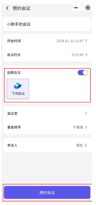 - 在小程序等预约入口预约会议时选择【飞书会议】预约飞书视频会议