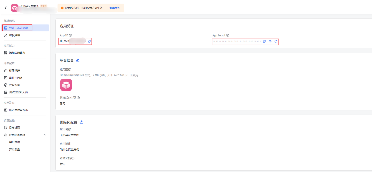 - 保存成功后,自动跳转进入应用详情获取APPID和APPSecret并保存